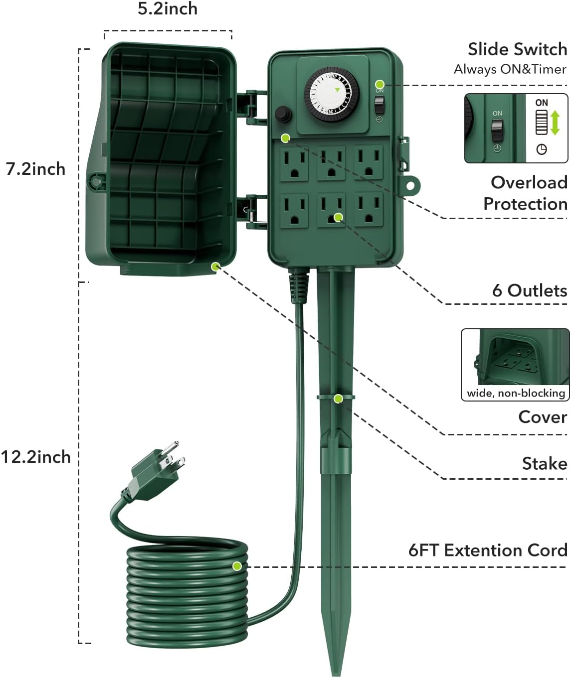 Safety is a top priority with this outdoor stake timer, as it is designed to shut off automatically in case of any electrical imbalance, providing protection against electrical shocks. The weatherproof cover ensures durability and protection against the elements, allowing you to use it even on rainy days. Additionally, individual safety covers for each outlet protect them from water, dust, and damage, while the 72-inch green cord seamlessly blends into your garden environment.